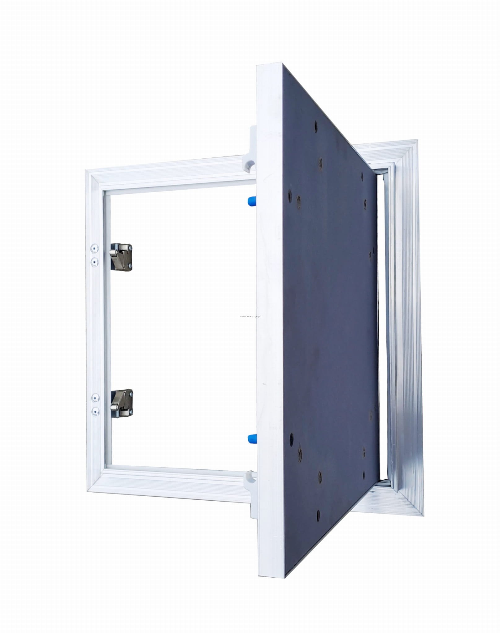Drzwi rewizyjne AKUSTIKA marki SILO wykonano z profili aluminiowych, które są spawane do ramy zewnętrznej i wewnętrznej. Konstrukcja jest połączona za pomocą stałych zawiasów, bez możliwości wyjęcia skrzydła. Wygodne otwieranie i zamykanie gwarantują dwa zamki zatrzaskowe klik-klak, które znajdują się na ramie zewnętrznej. Naciśnięcie wewnętrznej płyty ramy w miejscu zamka spowoduje otwarcie drzwi, natomiast ponowne kliknięcie - zamknięcie.