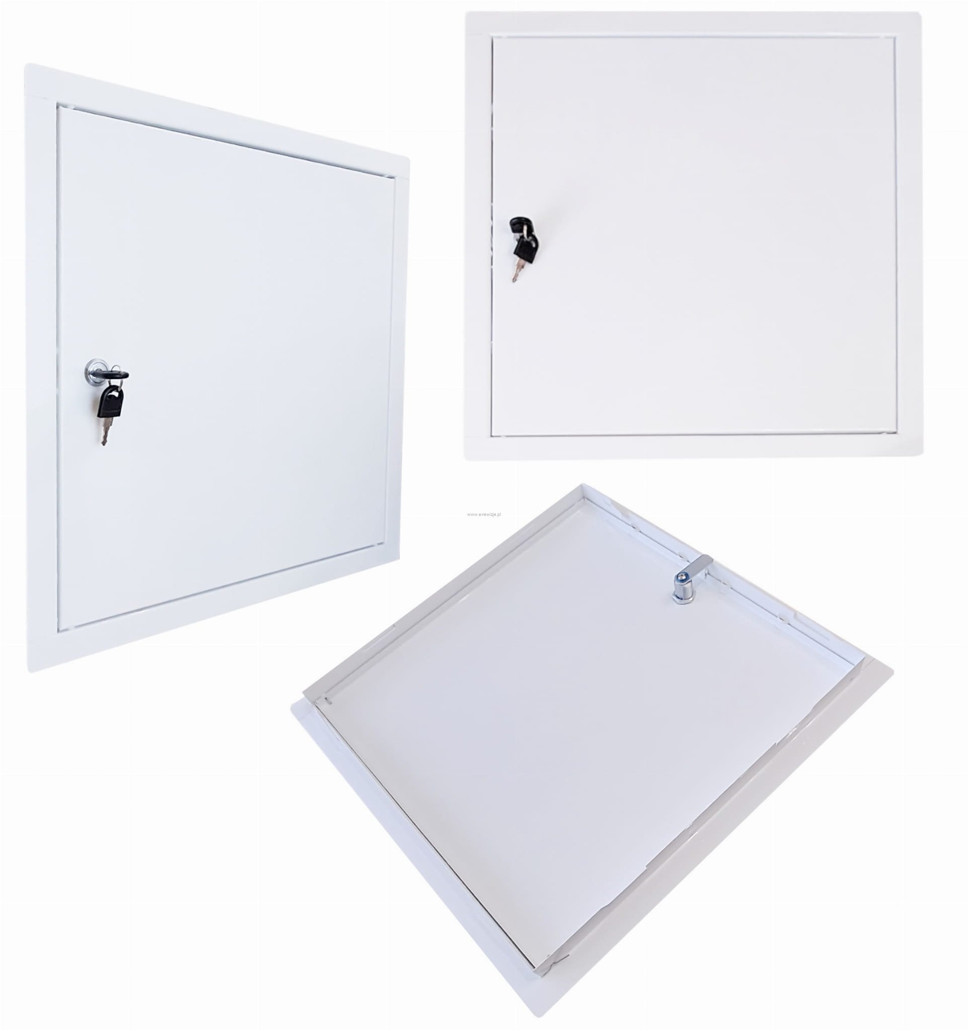- Wysokiej klasy drzwiczki rewizyjne metalowe, wykonane z ocynkowanej blachy, malowanej proszkowo na kolor biały i pokrytej mrozoodpornym lakierem, zamykane na klucz.