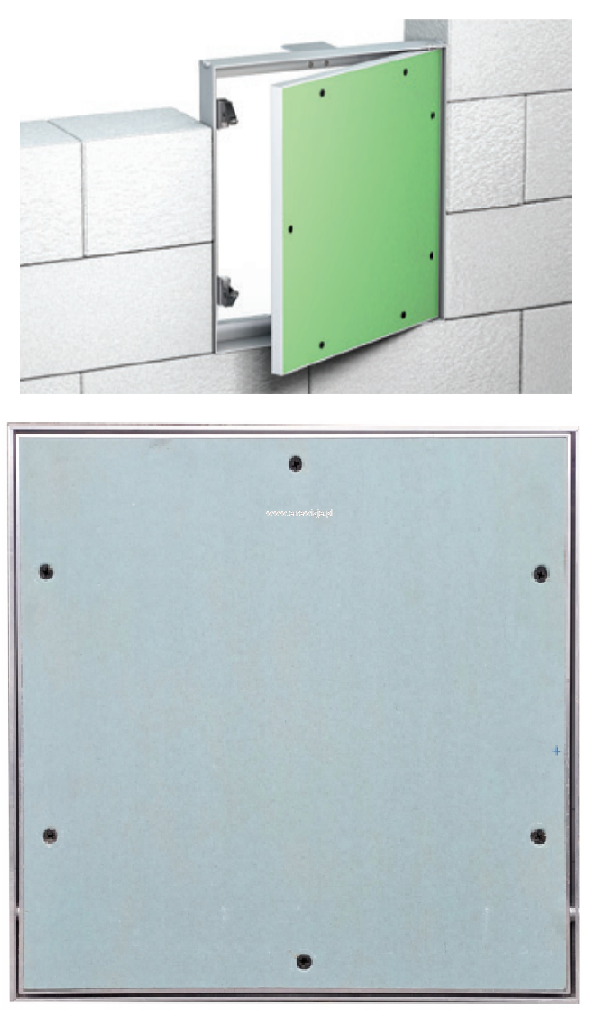 Rewizja wykonana ze spawanych profili aluminiowych tworzących wewnętrzną i zewnętrzną ramę. Cały zestaw jest podłączony za pomocą stałych zawiasów umożliwiających otwarcie drzwi w razie potrzeby. Rama zewnętrzna zawiera dodatkowe elementy montażowe. Model ten produkowany jest z impregnowaną płytą GK o grubości 12,5 mm w kolorze zielony, montowaną do ramy wewnętrznej za pomocą śrub.