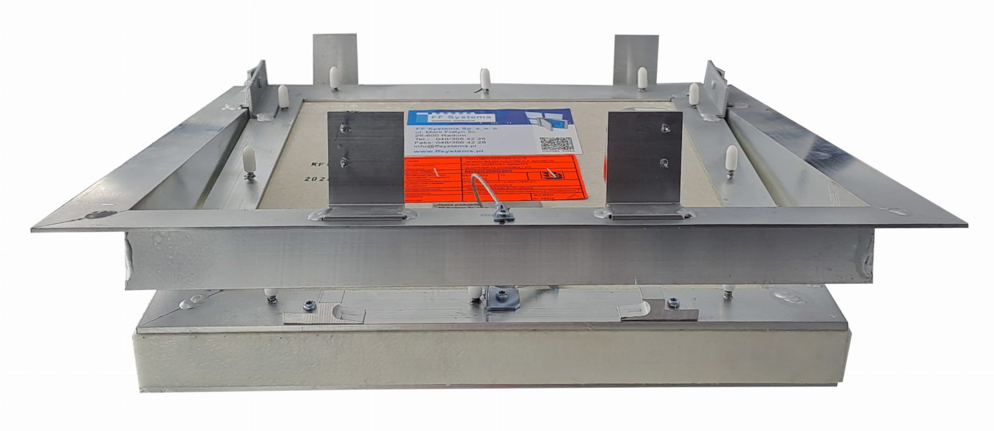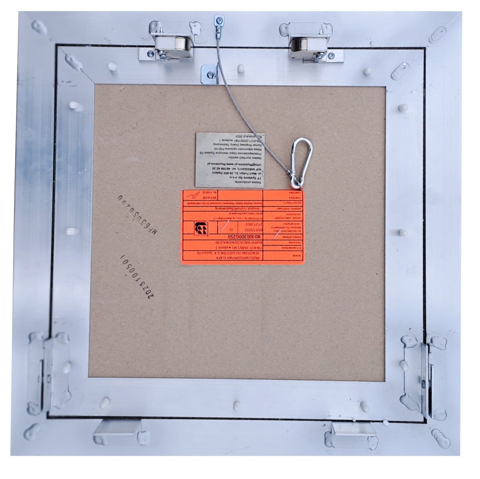 - WYPEŁNIENIE Z PŁYTY typu DF: Rewizja posiada wkładkę z płyty gipsowo-kartonowej GKF typu DF (płyta o podwyższonej odporności ogniowej) o grubości 2x15 mm.