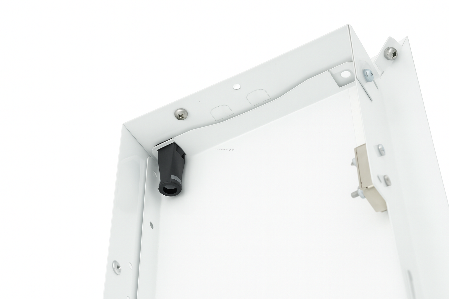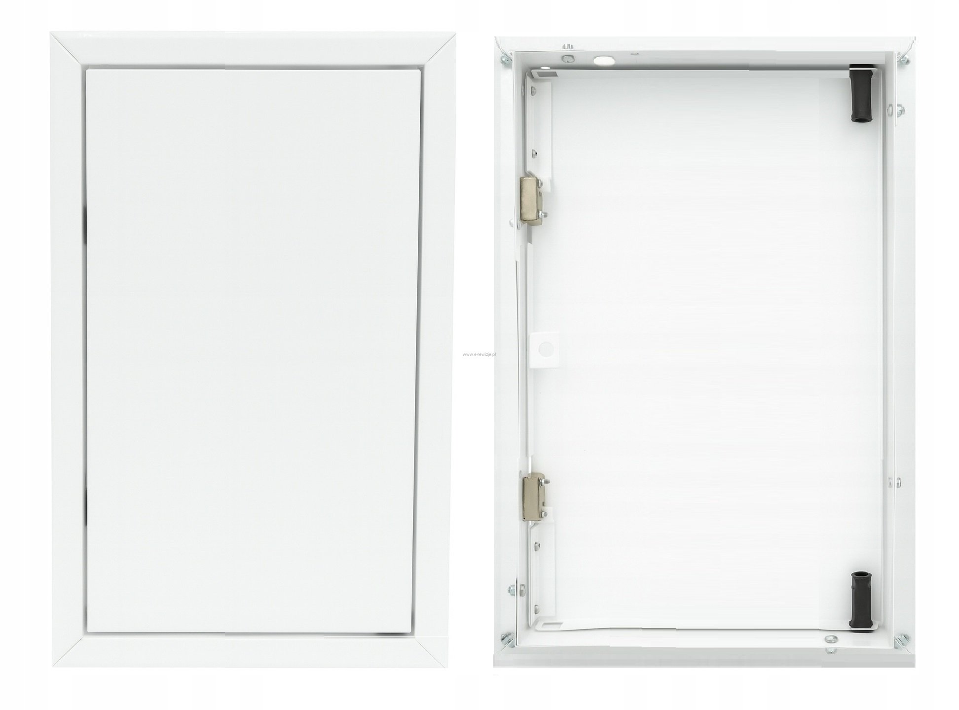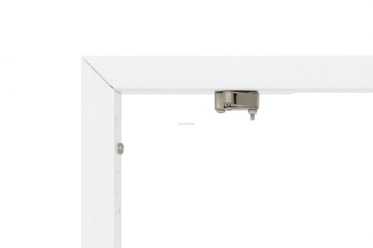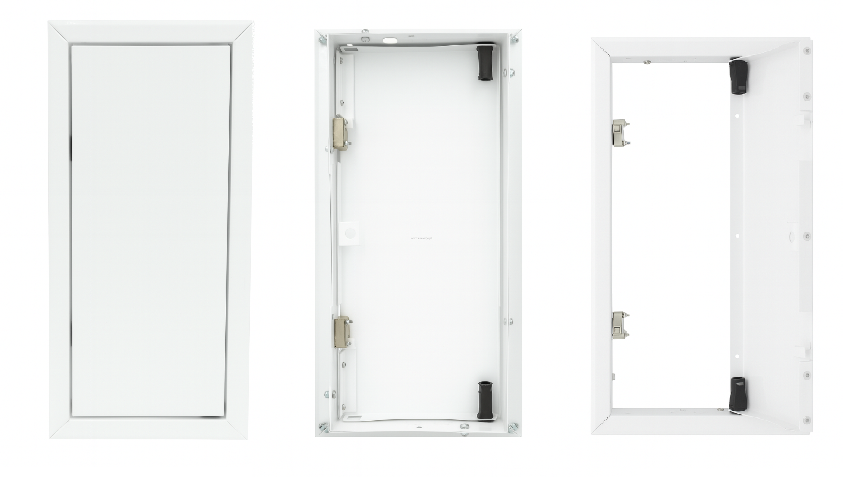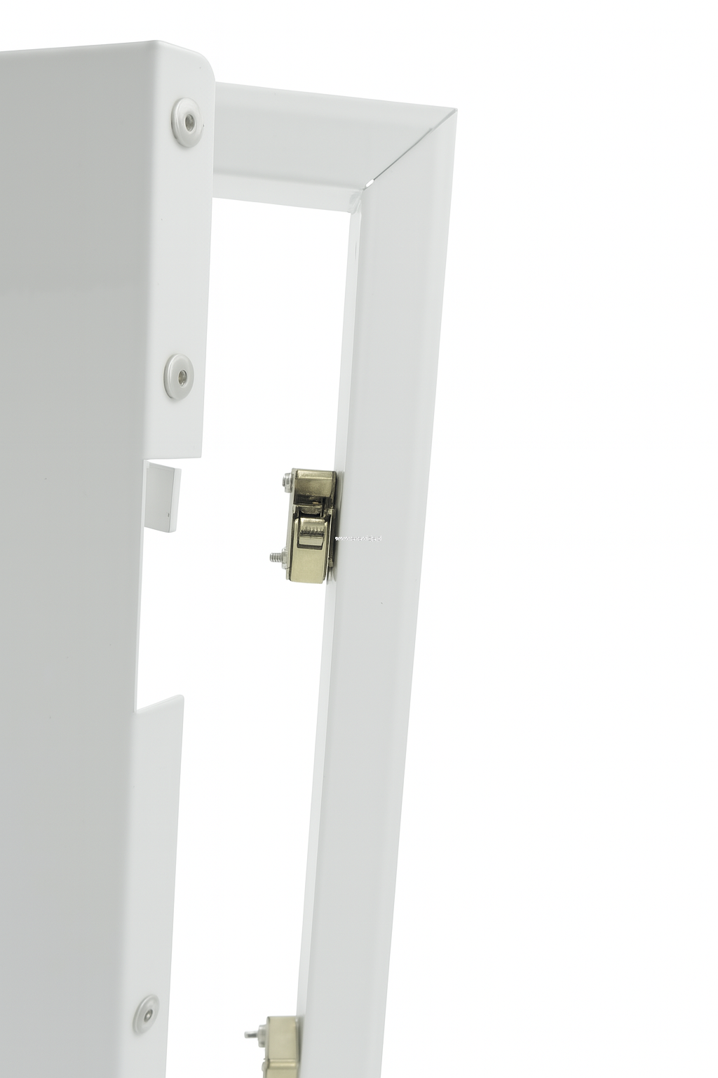 Wytrzymałe drzwiczki rewizyjne do zabudowy w ścianie lub na elewacji. Otwierane w prosty sposób dzięki systemowi klik-klak, który zapewnia szybki dostęp do instalacji. System ukrytych zamków sprawia, że na panelu brak widocznych zamków. Skrzydło całkowicie wyjmowane. Na uwagę zasługuje także elegancka, minimalistyczna konstrukcji. Drzwiczki estetycznie licują się z białą powierzchnią ściany. Dzięki ocynkowi mogą być także montowane w warunkach zewnętrznych, np. na elewacji.