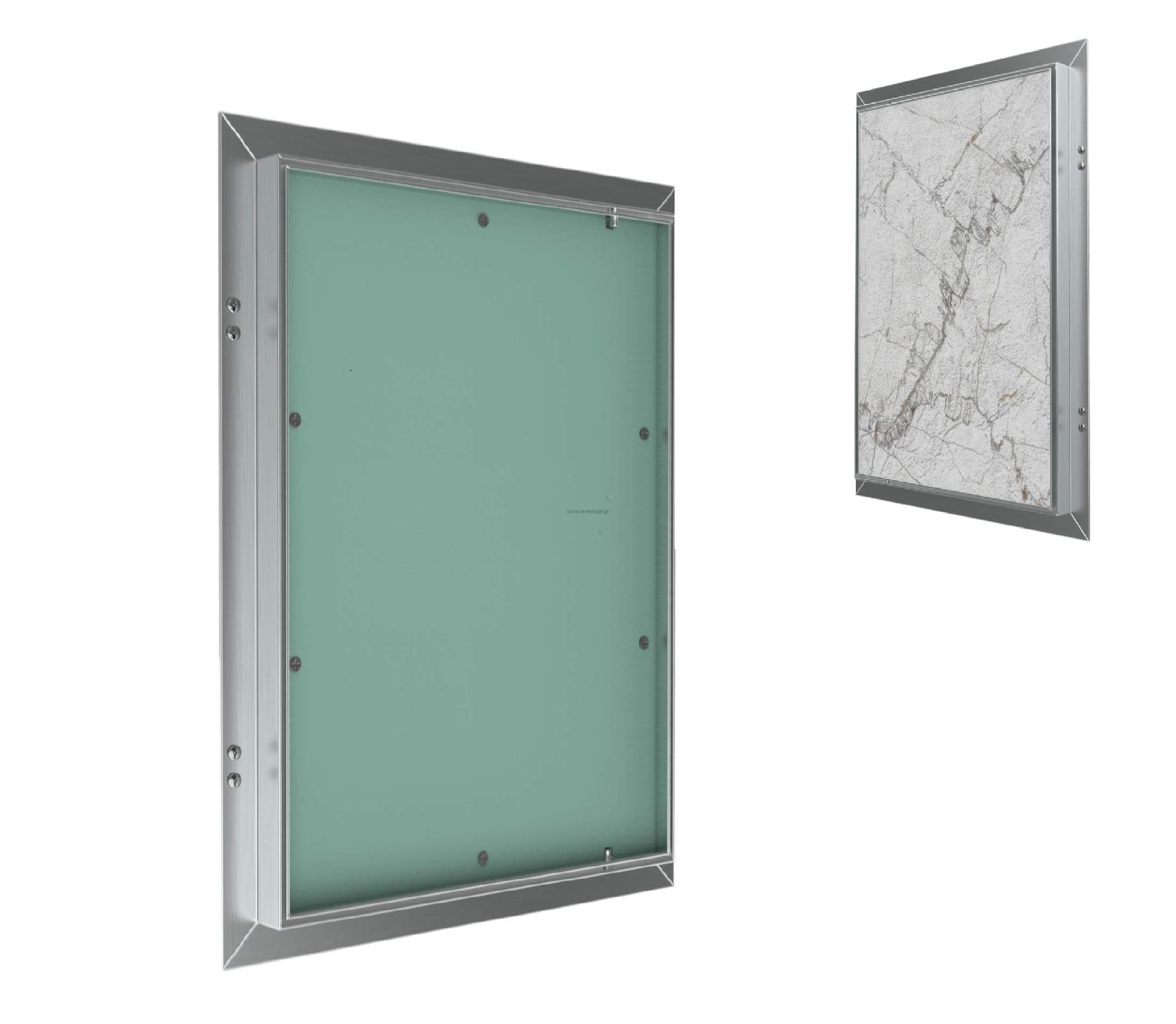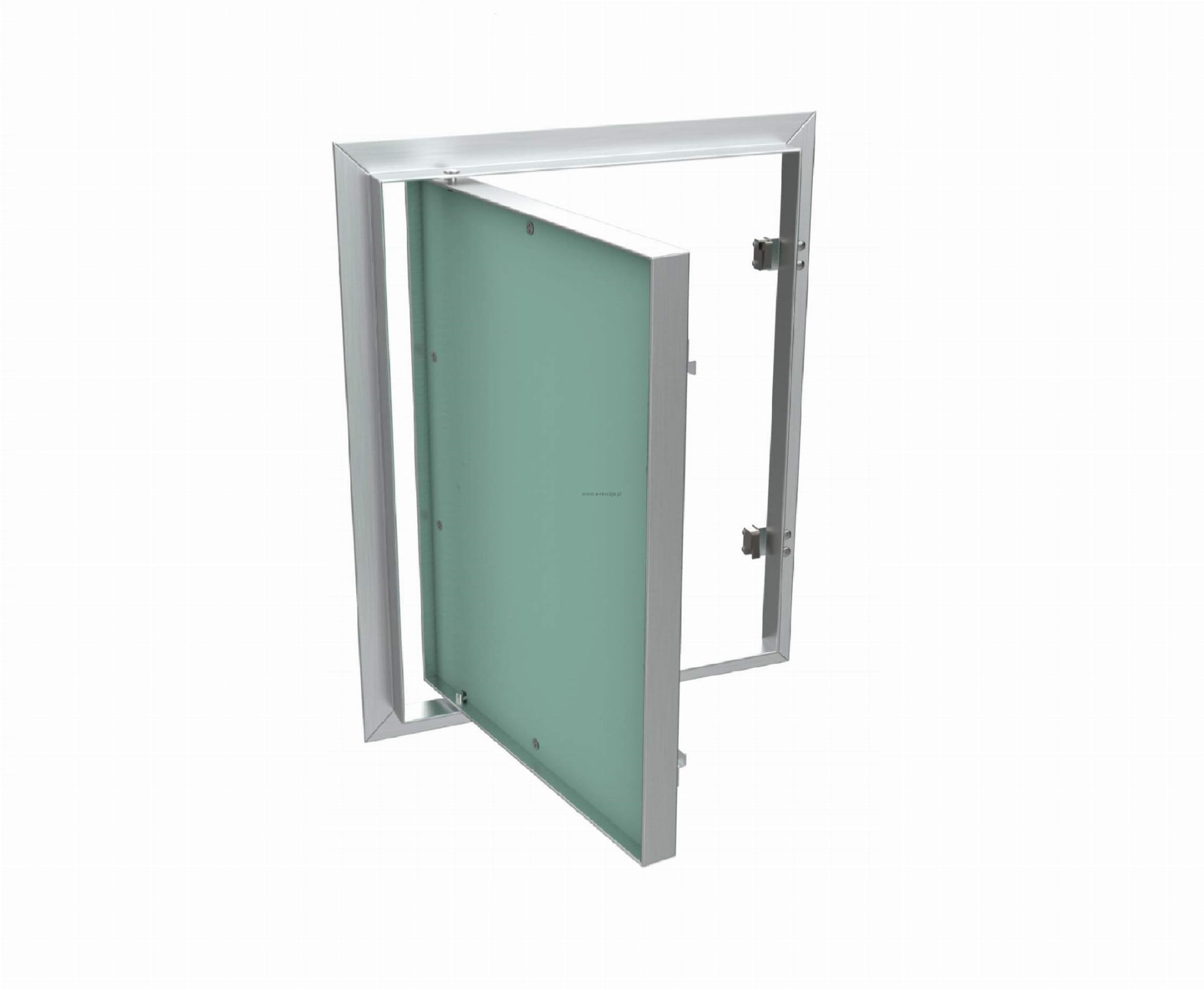 Drzwi rewizyjne CERAMIKO wykonane są z profili aluminiowych, które są spawane do ramy zewnętrznej i wewnętrznej. Cały zespół jest połączony za pomocą stałego zawiasu, co umożliwia otwarcie skrzydła drzwiowego w razie potrzeby. W wersji standardowej model ten produkowany jest z wodoodporną płytą w kolorze zielonym, mocowaną do ramy wewnętrznej za pomocą kleju o dużej wytrzymałości, co gwarantuje szybką i łatwą obróbkę powierzchni.