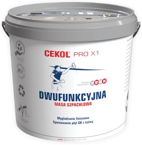 CEKOL PRO X1 to wysokiej jakości, gotowa do użycia dwufunkcyjna masa szpachlowa przeznaczona do wygładzania i spoinowania ścian oraz sufitów wewnątrz budynków. Idealna do powierzchni betonowych, gipsowych, tynków cementowo-wapiennych, płyt gipsowo-kartonowych oraz trwałych powłok malarskich.