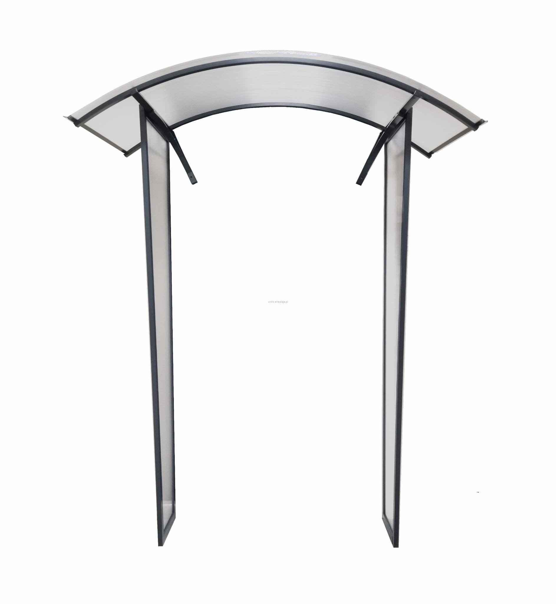 - Zadaszenie w postaci daszku nad drzwi z dwoma ściankami bocznymi- konstrukcja wykonana z poliwęglanu 4-komorowego w kolorze bezbarwnym oraz aluminiowej ramy malowanej proszkowo na kolor grafitowy. Poliwęglan o grubości 4 mm charakteryzuje się odpornością na uderzenia i promieniowanie UV, nie odbarwia się i nie kruszy. Aluminiowa rama sprawia, że konstrukcja jest mocna i stabilna.