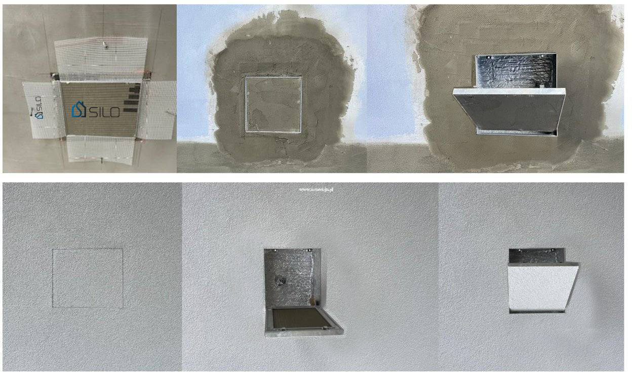 Celem montażu drzwiczek należy wykonać otwór w styropianie wielkości części wewnętrznej drzwiczek, następnie wyciąć wokół rant wielkości części zewnętrznej drzwiczek. Umieścić drzwiczki we wcześniej wyciętym otworze, tak by licowały się z reszta styropianu. Wywinąć na zewnątrz siatkę przymocowana do drzwiczek i nałożyć na nią siatkę wykorzystywana do elewacji. Na obie warstwy siatki nałożyć klej. Część wewnętrzna drzwiczek dzięki zastosowaniu płyty budowlanej jest gotowa do nałożenia tynku po uprzednim zagruntowaniu.