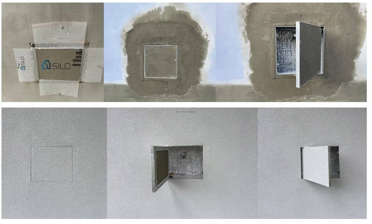 Celem montażu drzwiczek należy wykonać otwór w styropianie wielkości części wewnętrznej drzwiczek, następnie wyciąć wokół rant wielkości części zewnętrznej drzwiczek. Umieścić drzwiczki we wcześniej wyciętym otworze, tak by licowały się z reszta styropianu. Wywinąć na zewnątrz siatkę przymocowana do drzwiczek i nałożyć na nią siatkę wykorzystywana do elewacji. Na obie warstwy siatki nałożyć klej. Część wewnętrzna drzwiczek dzięki zastosowaniu płyty budowlanej jest gotowa do nałożenia tynku po uprzednim zagruntowaniu.