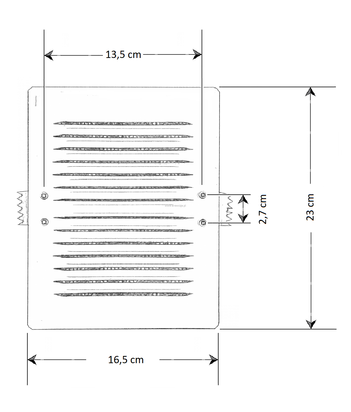 - Metalowa płaska kratka ze skośnymi żeberkami.