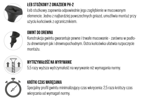 - Posiadają łeb stożkowy płaski, który zapewnia odpowiednie zagłębienie w mocowanym elemencie oraz gwint do drewna zakończony ostrą końcówką, co zapewnia trwałe i pewne mocowanie w podłożu drewnianym oraz ułatwia rozpoczęcie montażu.